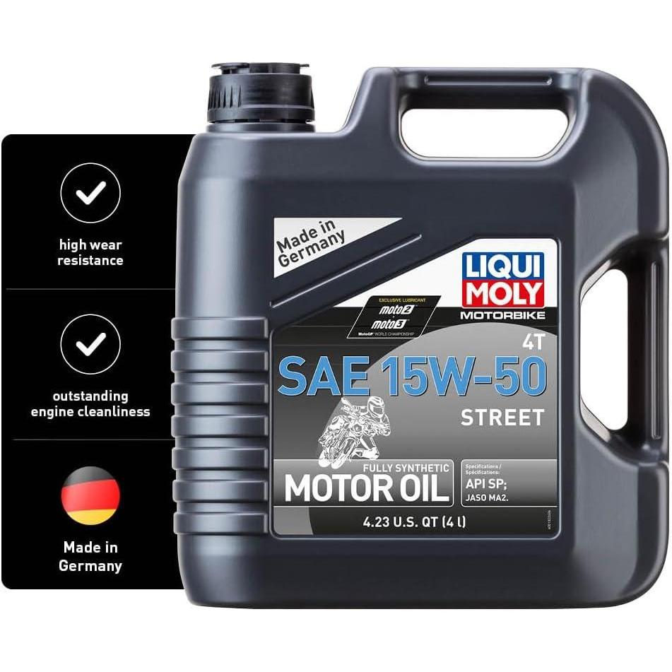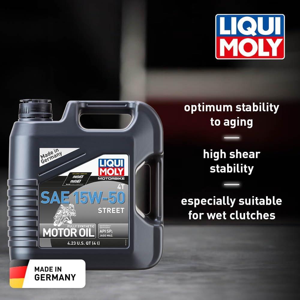Liqui Moly's Motorbike 4T 15W-50 Street high-performance engine oil tailored for use in air-cooled and water-cooled four stroke motorbike engines. It has been specially developed for all-year use in normal to heavy-duty street, dirt and racing bikes, including quad bikes and scooters. Selected basic oils and high-quality additives ensure optimal lubrication, excellent engine cleanliness and impressive friction coefficients in all operating conditions. Liqui Moly's Motorbike 4T 10W-50 is thus ideally suited for use with and without a wet clutch. Many Japanese manufacturers prescribe lubricants of this viscosity for older bikes made in the 1990s. Ideally suited for use with and without a wet clutch.